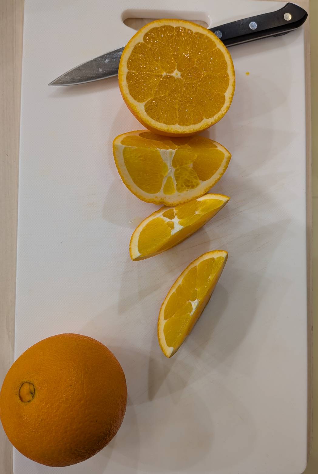 ②オレンジを倒し、房の断面が見える向きでスライスカット